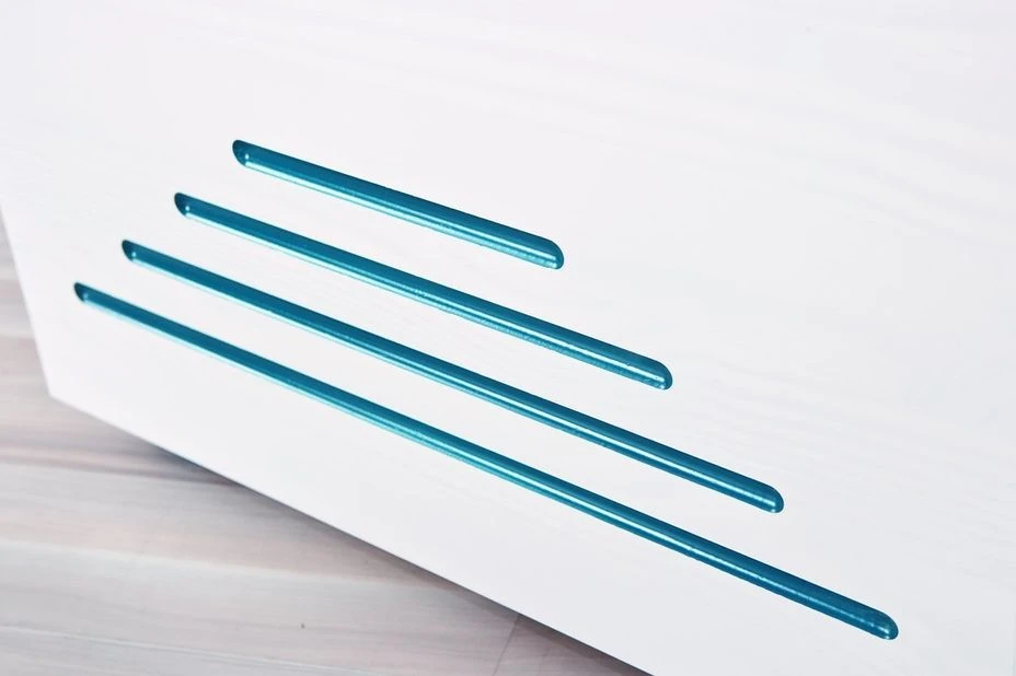Quatre pieds résistants et une décoration en forme de trapèze à l’avant.