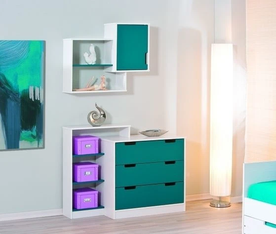 Chambre Enfant 4 Pièces Lit Chevet Et 2 étagères Bois Laqué Vert Et Pin Clair Kiddy 90×200 Cm