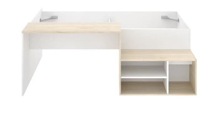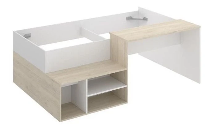 KRIC Lit combiné enfant avec bureau et meuble de rangement. – Structure en panneau de particules revêtus d’une mélamine décor Chêne naturel et blanc – Couchage 90 x 190 cm – Livré sans sommier ni matelas – Dimensions totales : L 195 x P 134 x H 72 cm