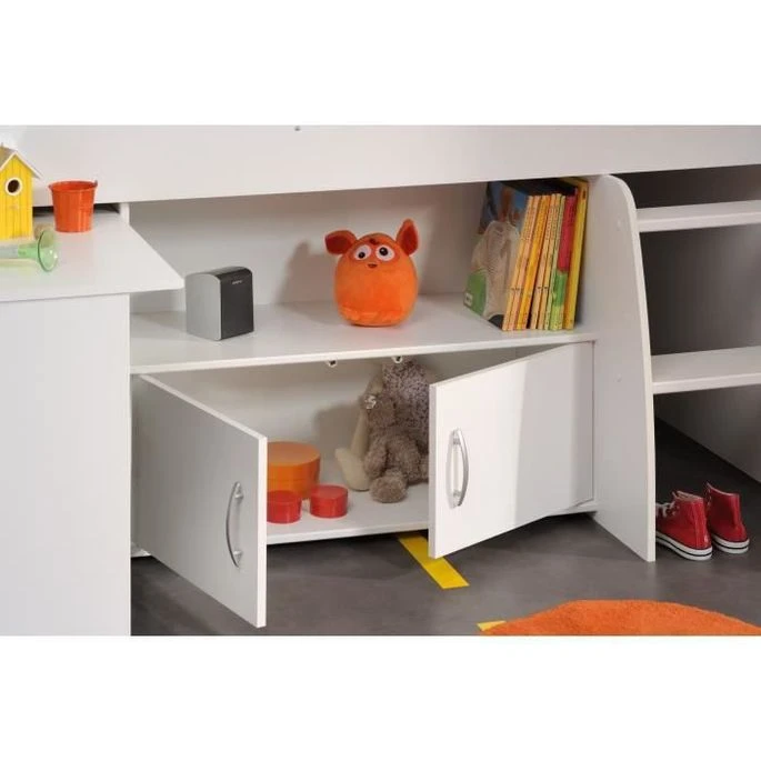 Ensemble incluant un lit en hauteur, un bureau et du rangement.