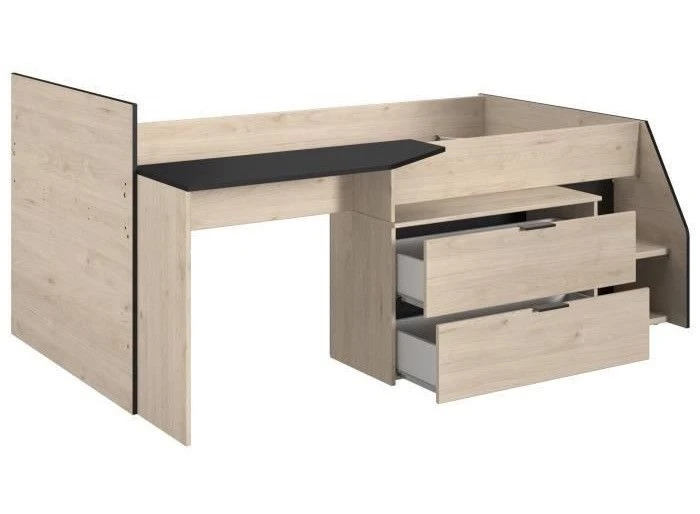 Lit Combiné enfant avec bureau et 2 tiroirs de rangement – Structure en panneaux de particules – Revêtement en papier décor Chêne Jackson et Blanc – Couchage 90 x190 ou 200 cm (Réducteur inclus)