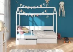 Lit Enfant Cabane Bois Pin Naturel Et Bois Blanc 90×200 Cm Avec 2 Tiroirs De Rangement Forka