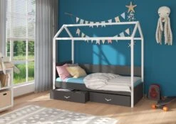 Lit Enfant Cabane Bois Pin Blanc Et Gris Graphite 90×200 Cm Avec 2 Tiroirs De Rangement Forka