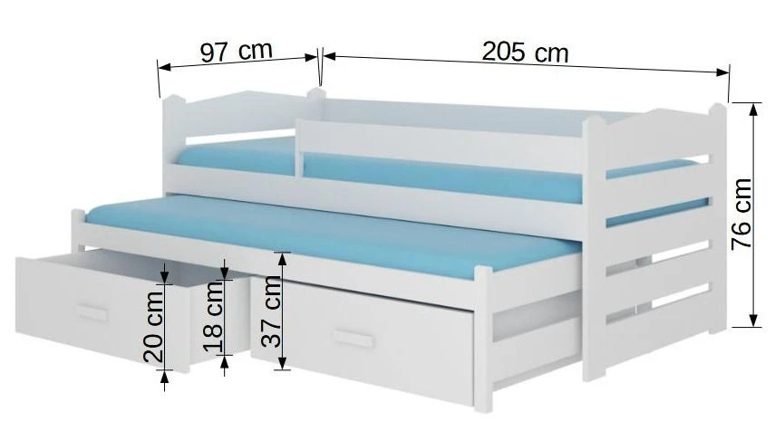 Le lit du bas et les 2 coffres de rangement sur roulettes se glissent sous le lit du haut. Ces 2 couchages de 90×200 cm, permettent Ă vos enfants de dormir confortablement et en toute quiĂ©tude.