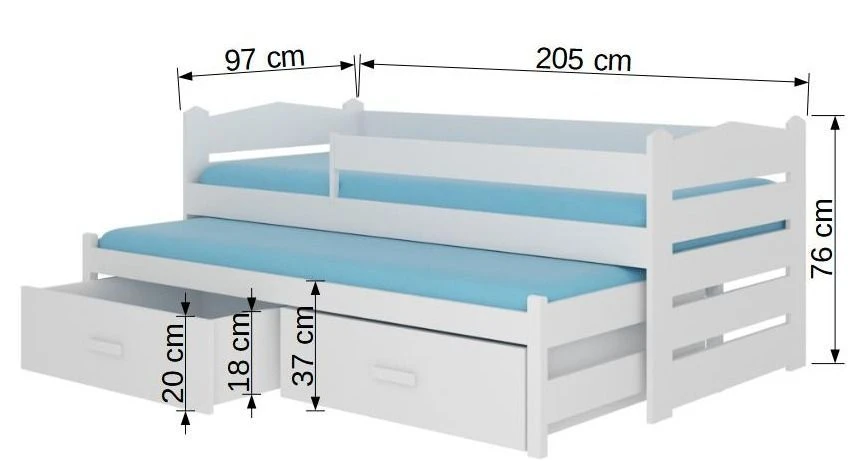 Le lit du bas et les 2 coffres de rangement sur roulettes se glissent sous le lit du haut. Ces 2 couchages de 90×200 cm, permettent à vos enfants de dormir confortablement et en toute quiétude.
