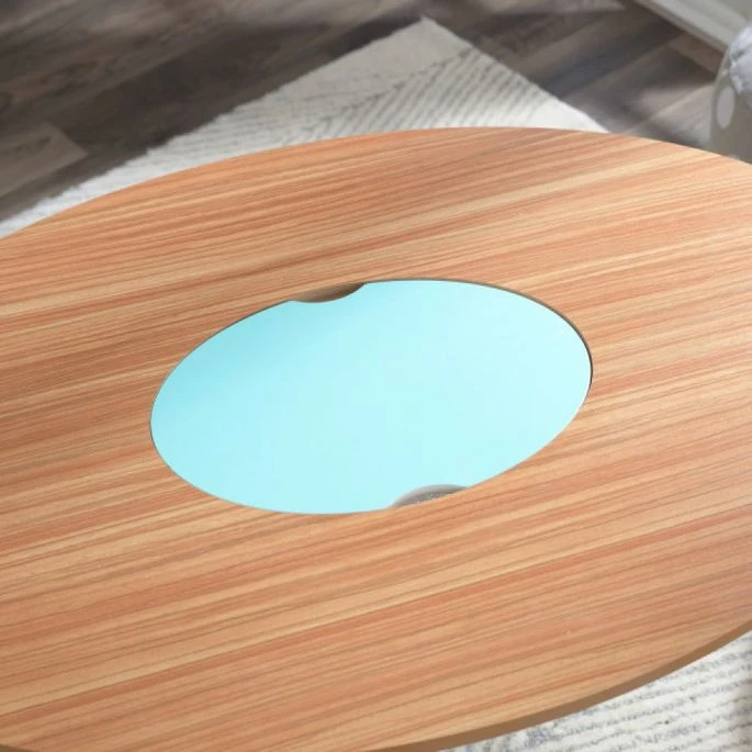 Couvercle réversible au niveau du plateau de table : 1 face bleu clair, 1 face blanche